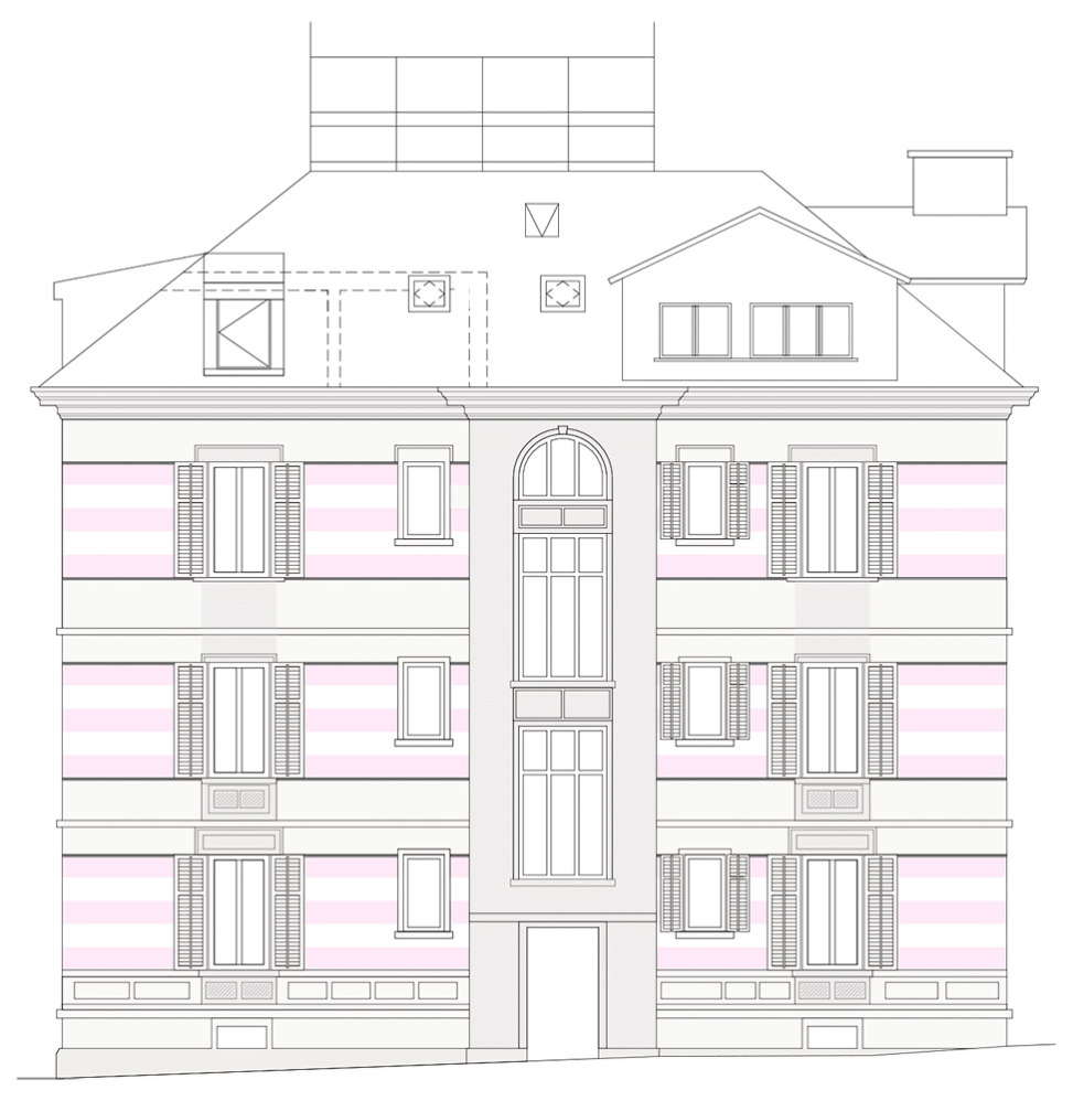 Im Zuge der Gesamtrenovation der Fassade und der Neueindeckung des Dachs mit dem Umbau der nördlichen Mansardenzimmer in eine Dachwohnung sollte das Haus seinen äusseren Reiz zurückerhalten. Die gestreifte Fassadenbemalung ist eine Referenz an die ursprüngliche Bemalung. Für die Gauben war ebenfalls eine moderne Interpretation des Themas mit teilweise verglasten Gauben vorgesehen; dafür hätte man auf Dachflächenfenster verzichten können. Leider wurde uns die Umsetzung dieser Idee von den Bewilligungsbehörden verweigert, sodass nun eine Kombination von Gauben und Veluxfenstern eingebaut wurde.