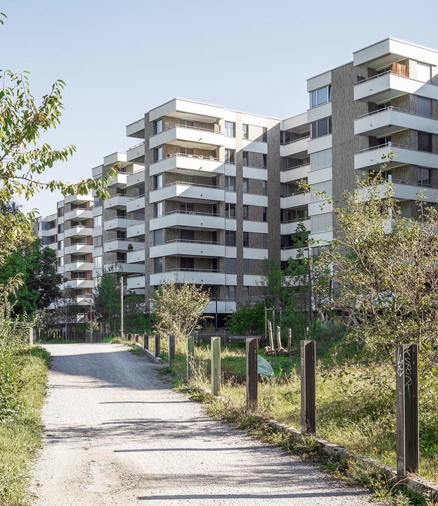 Die Aufteilung in vier Gebäudekörper schafft einen städtebaulichen Rhythmus und Hauseinheiten, die sich an der Massstäblichkeit der anderen Bebauungen orientieren. Über einem massiven Sockel liegen acht Wohngeschosse, die sich mit der Landschaft verzahnen und trotz ihrer Grösse eine Leichtigkeit ausstrahlen sollen.